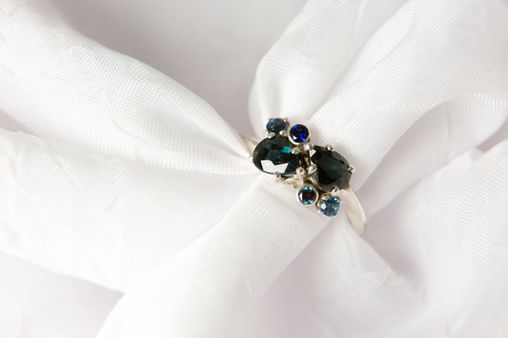 Of course, I chose a Toi et Moi ring. Translating to 'You & Me' in French, this ring style is the classic romantic gesture. The two centre stones are pear cut blue/green Sapphires, accented by Blue Garnet, Alexandrite, Sapphire and Blue Topaz, all to represent the couples children by birthstone.